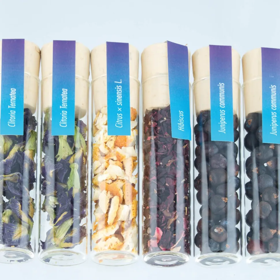 6 Glasröhrchen mit Hibiskusblüten, Wacholderbeeren, Orangenschale, Schmetterlingsblume