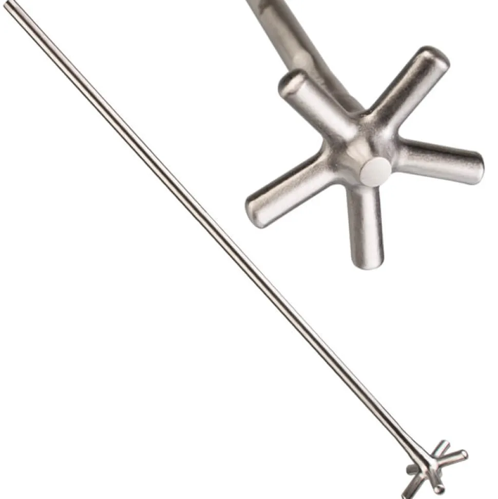 Dieses schlichte und praktische Exemplar besteht aus Edelstahl und hat an seinem unteren Ende 5 abstehende Stäbe. Wird der Rührstab durch drehen zwischen den Handflächen in Bewegung gesetzt, quirlen diese die Flüssigkeit auf. Anders als mit einem Rührlöffel werden die Zutaten des Drinks nicht einfach vermengt, sondern es wird Luft eingemischt. Neben dieser sogenannten Aerifizierung sorgt der Swizzle Stick auch für eine schnelle Kühlung, wenn damit Crushed Ice im Drink verwirbelt wird.
