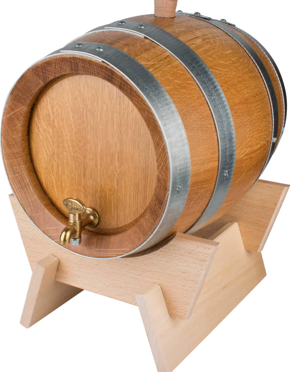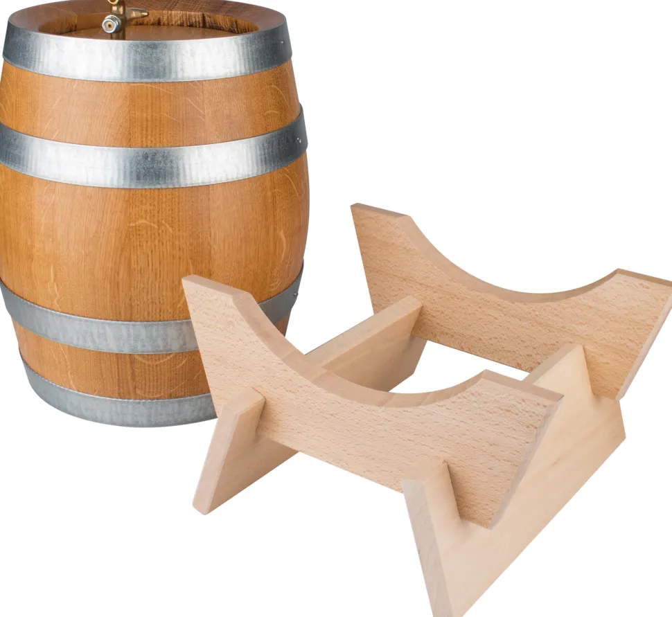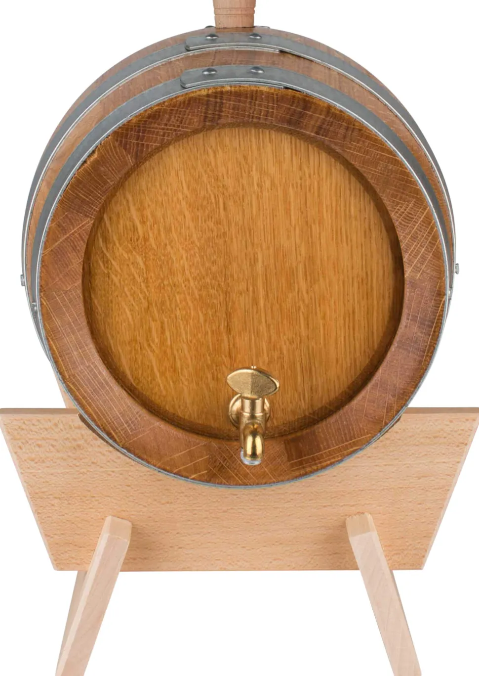 Lieferumfang: Fass, Untergestell (Spund) unmontiert, Dichtungskorken, Zapfhahn aus Messing, Gebrauchanleitung