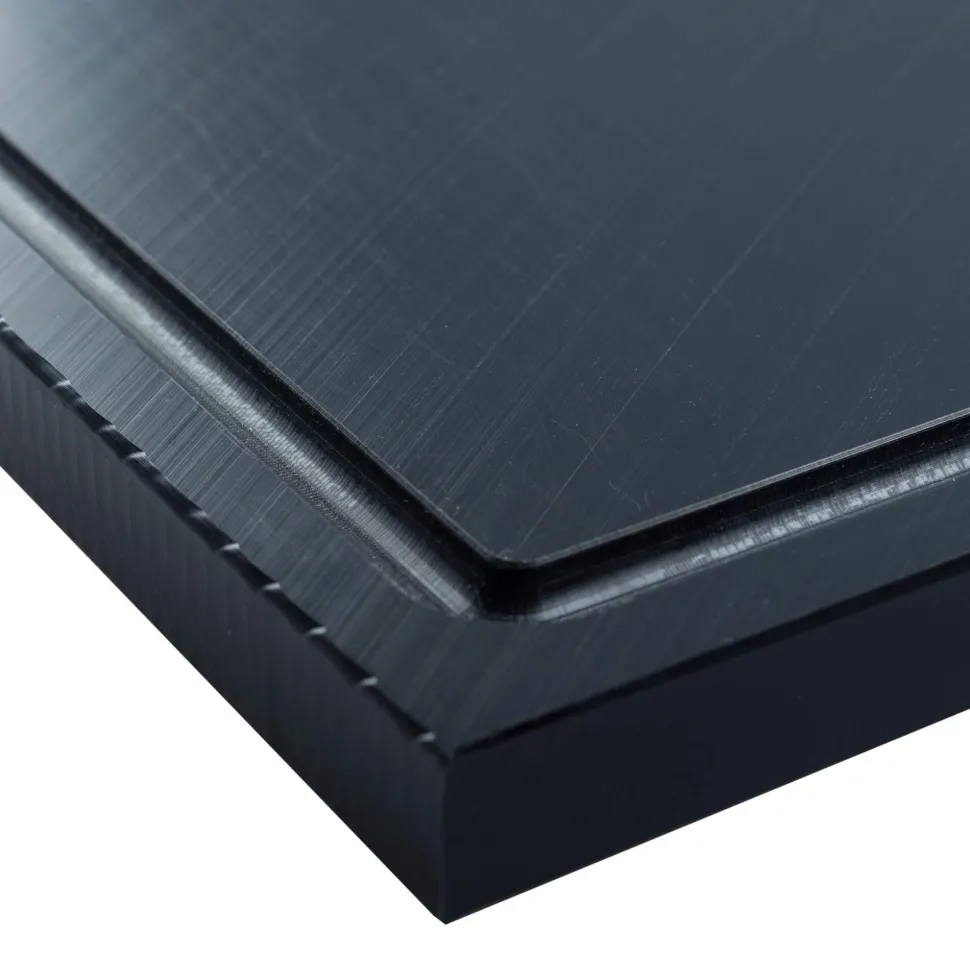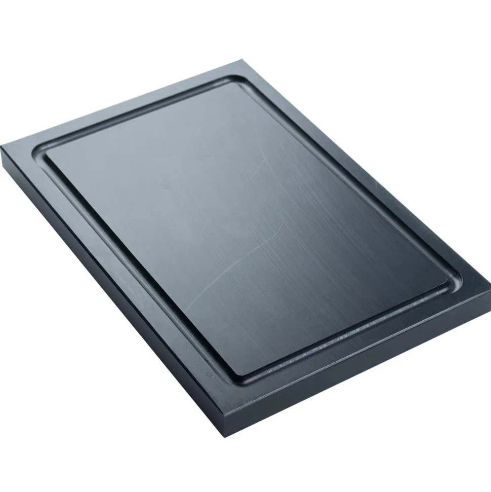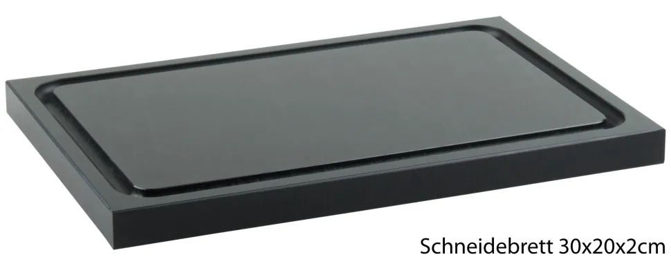 Für Profi-Küchen und Bars gut zu wissen: Der Kunststoff ist durchgefärbt und behält auch beim Abhobeln seine schwarze Farbe. Das Schneidebrett wurde aus gepresstem, hoch verdichtetem Kunststoff geschnitten. Dieses Material ist deutlich langlebiger als gegossene Bretter.