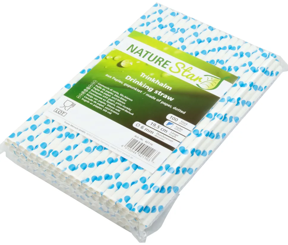 Produktdaten für Trinkhalme, Papier (6x195mm), Punkte (blau-weiß) – 100 Stk.