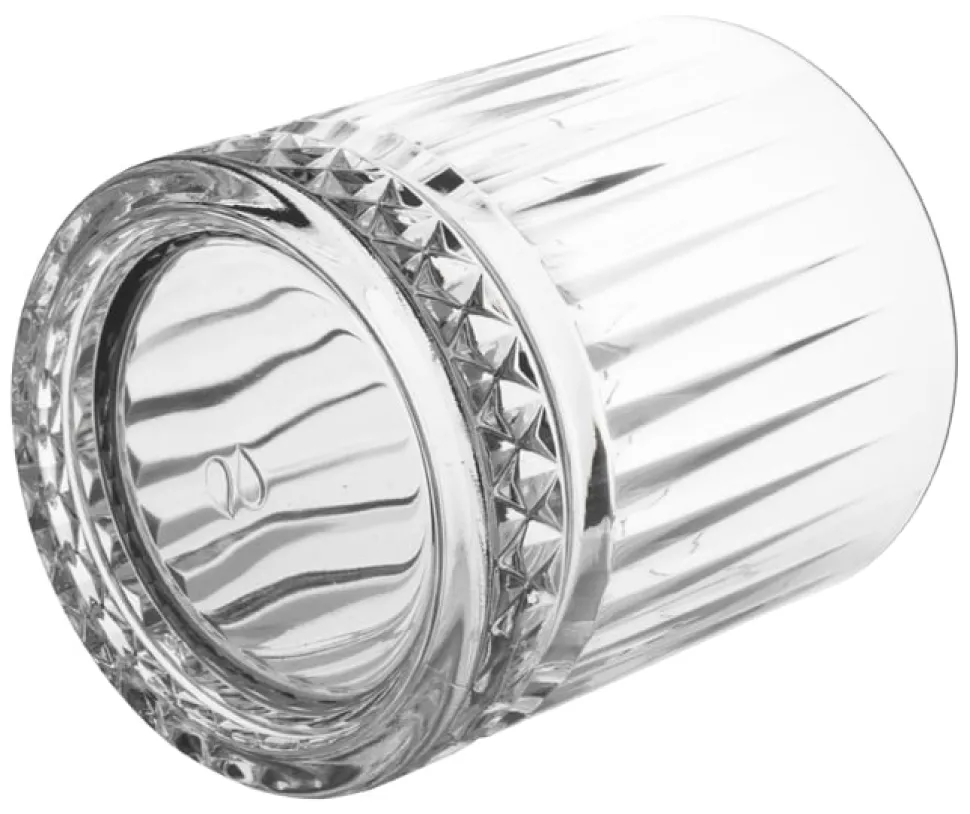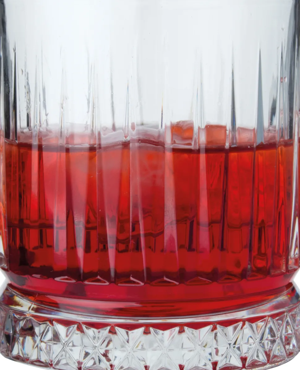 Der Schliffdekor fasziniert durch seine Dynamik: die senkrechten Einkerbungen lassen das Glas leichter wirken, wobei sie gleichzeitig den schweren Boden betonen, der mit einem geometrischen Muster versehen ist. Dreht oder schwenkt man das Glas in der Hand, so hat man das Gefühl, dass die Formen des Musters mittanzen und immer neue Formen kreieren. Boden und Körper sind klar voneinander getrennt und die Finger ruhen perfekt auf der Einkerbung dazwischen.